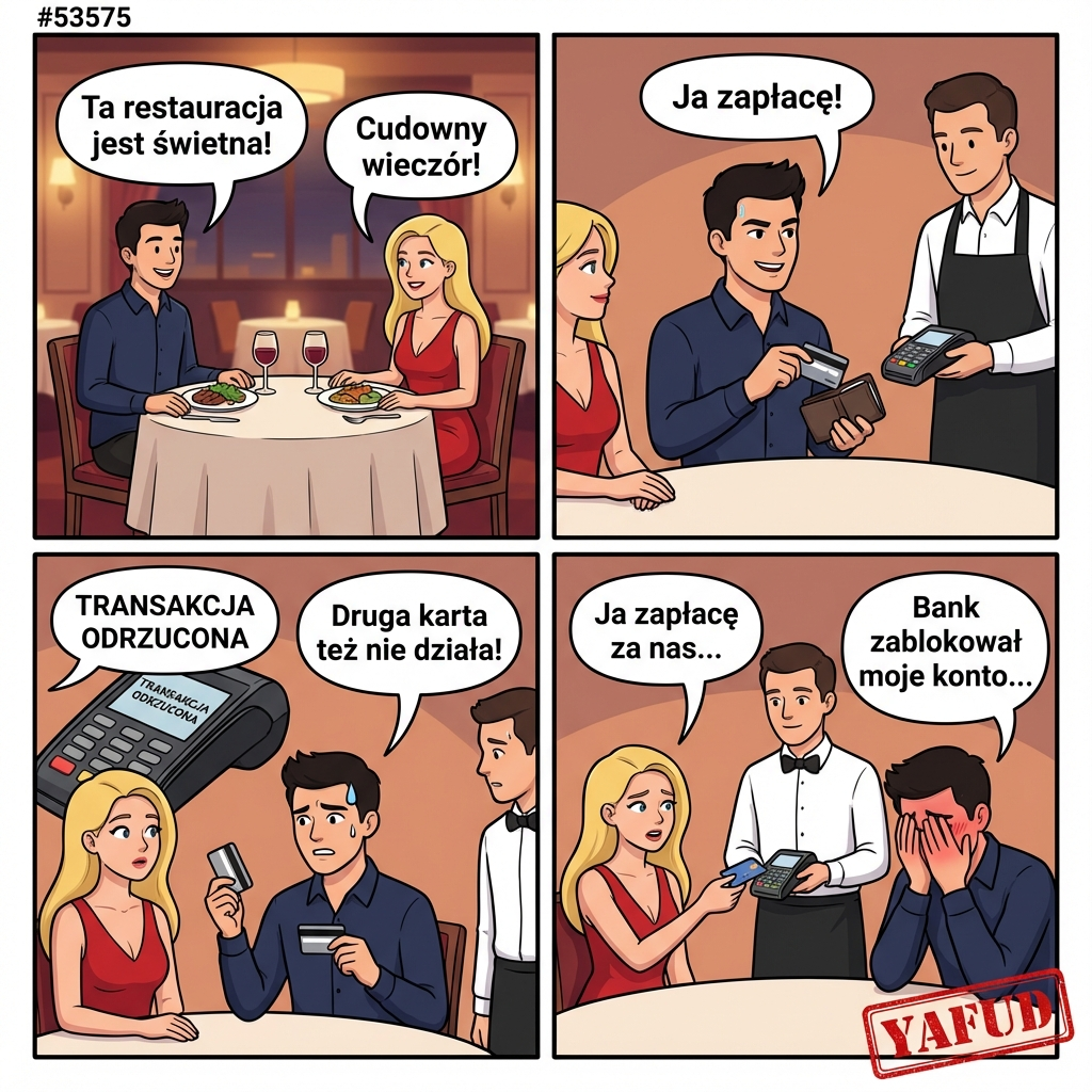 Umówiłem się na randkę z dziewczyną, która bardzo mi się podobała. Poszliśmy do ekskluzywnej restauracji, atmosfera była świetna, a jedzenie pyszne. Kiedy przyszło do płacenia, pewnym ruchem wyciągnąłem kartę, ale terminal odrzucił transakcję. Spróbowałem innej karty – to samo, gotówki przy sobie nie miałem. Okazało się, że bank zablokował mi konto z powodu „podejrzanej aktywności”, którą był mój wcześniejszy zakup gry online. Dziewczyna musiała za nas zapłacić, a ja spaliłem się ze wstydu. YAFUD«Poprzednia wpadka