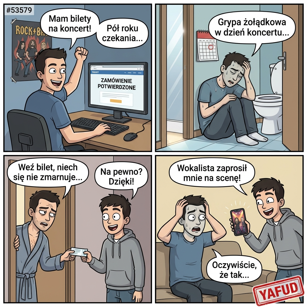 Kupiłem bilety na koncert mojego ulubionego zespołu pół roku wcześniej. W dzień koncertu dostałem grypy żołądkowej i nie mogłem wyjść z łazienki. Oddałem bilet młodszemu bratu, żeby się nie zmarnował. Następnego dnia dowiedziałem się, że wokalista zaprosił jedną osobę z widowni na scenę – mojego brata. YAFUD«Poprzednia wpadkaNastępna wpadka »