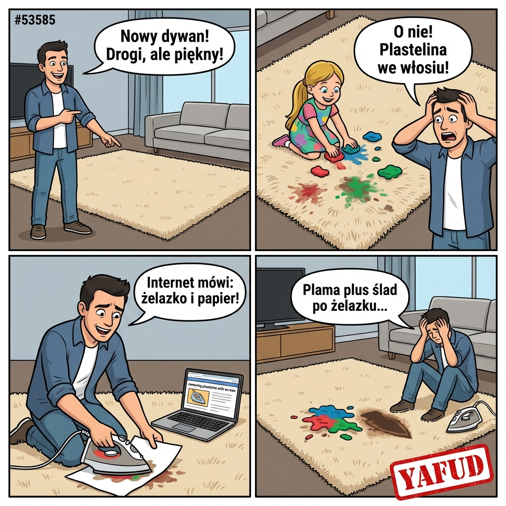 Kupiłem nowy, drogi dywan do salonu, jasny beż. Pierwszego dnia moja córka postanowiła pobawić się na nim plasteliną. Plastelina wtarła się we włosie tak mocno, że nie dało się jej wydłubać. Próbowałem użyć żelazka i papieru, jak radziły fora internetowe, ale tylko przypaliłem dywan. Teraz mam dywan z kolorową plamą i śladem żelazka na środku. YAFUD«Poprzednia wpadkaNastępna wpadka »