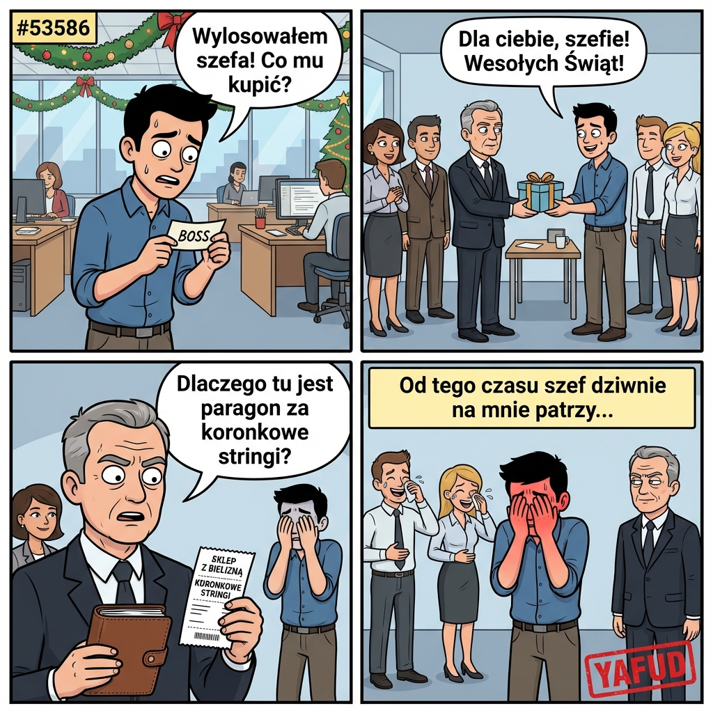 Mieliśmy w biurze loterię na Mikołajki i wylosowałem szefa. Kupiłem mu elegancki planner, ale przez pomyłkę zapakowałem też paragon ze sklepu z bielizną, który odwiedziłem wcześniej dla żony. Szef otworzył prezent przy wszystkich i zapytał, dlaczego dołączam rachunek za koronkowe stringi. Wszyscy wybuchnęli śmiechem, a ja chciałem zapaść się pod ziemię. Od tego czasu szef dziwnie na mnie patrzy. YAFUD«Poprzednia wpadkaNastępna wpadka »
