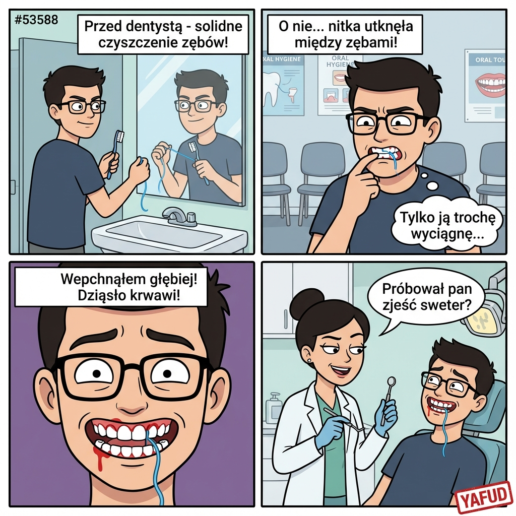 Miałem wizytę u dentysty, więc solidnie umyłem zęby i użyłem nici dentystycznej. Niestety kawałek nici urwał się i utknął mi między jedynkami. Próbowałem go wydłubać w poczekalni, ale tylko wepchnąłem go głębiej, raniąc dziąsło. Wszedłem do gabinetu z krwawiącym uśmiechem i kawałkiem niebieskiej nitki zwisającym z zęba. Dentystka zapytała, czy próbowałem zjeść sweter. YAFUD«Poprzednia wpadkaNastępna wpadka »