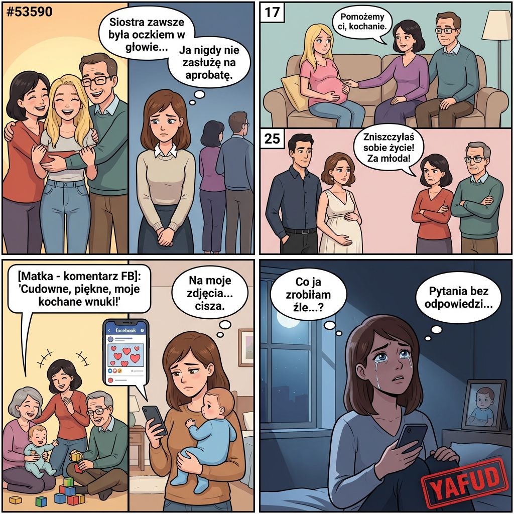 Moja młodsza siostra z jakiegoś powodu zawsze była oczkiem w głowie rodziców. Nawet jak popełniała grube błędy, to nadal dla nich była najlepsza na świecie. Ja, choćbym na rzęsach stanęła, nigdy nie zasłużę na ich aprobatę. Ale za to jeśli popełnię jakiś choćby mały błąd, to przez miesiąc lub dłużej będą mi go wypominać i to jeszcze takim tonem jakbym co najmniej popełniła przestępstwo. Moja siostra w wieku 17 lat zaszła w przypadkową ciążę, nie wie kto jest ojcem. Rodzice przyjęli to bardzo spokojnie, dziecko się urodziło, pomagali przy nim. Ja zaszłam w ciążę w wieku 25 lat z moim mężem. Rodzice wmawiają mi że życie sobie zniszczyłam, bo w tak młodym wieku nie powinnam mieć jeszcze dzieci. Absolutnie nie chcą nawet nas odwiedzić, by spędzić z nim czas, widzieli się tylko raz. Natomiast siostra urodziła niedawno drugie, też z nieznanym typem i rodzice chętnie je niańczą całymi dniami i się nim zachwycają. Gdy wysyłam rodzicom zdjęcia mojego dziecka, nic nie odpisują. Ale gdy tylko siostra wstawi zdjęcie swoich dzieci na fejsa, to mama nawala komentarzami jak karabin maszynowy w stylu "jakie cudowne, piękne, wspaniałe, moje kochane wnuki". Codziennie zastanawiam się, co ja zrobiłam źle, że mnie tak traktują, codziennie zasypiam z milionem pytań w głowie, na które nie znajduję odpowiedzi. Wielokrotnie podejmowałam temat z rodzicami, ale oni się wypierają, że nic takiego nie ma miejsca i sobie coś uroiłam. YAFUD«Poprzednia wpadka