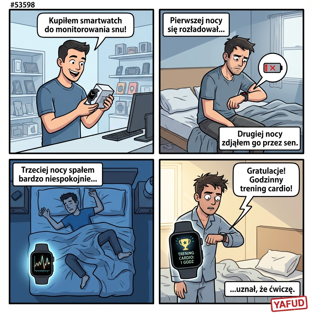 Kupiłem smartwatch, żeby monitorować swój sen. Pierwszej nocy zegarek się rozładował. Drugiej nocy zdjąłem go nieświadomie przez sen. Trzeciej nocy spałem tak niespokojnie, że zegarek uznał, iż ćwiczę. Rano pogratulował mi godzinnego treningu cardio. YAFUD«Poprzednia wpadkaNastępna wpadka »
