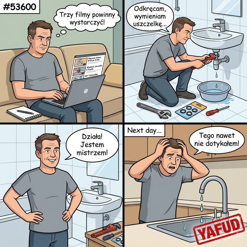 Postanowiłem naprawić cieknący kran w łazience. Obejrzałem trzy filmy na YouTube, kupiłem narzędzia. Odkręciłem co trzeba, wymieniłem uszczelkę. Kran przestał cieknąć. Następnego dnia zaczął cieknąć ten w kuchni, którego nawet nie dotykałem. YAFUD«Poprzednia wpadkaNastępna wpadka »