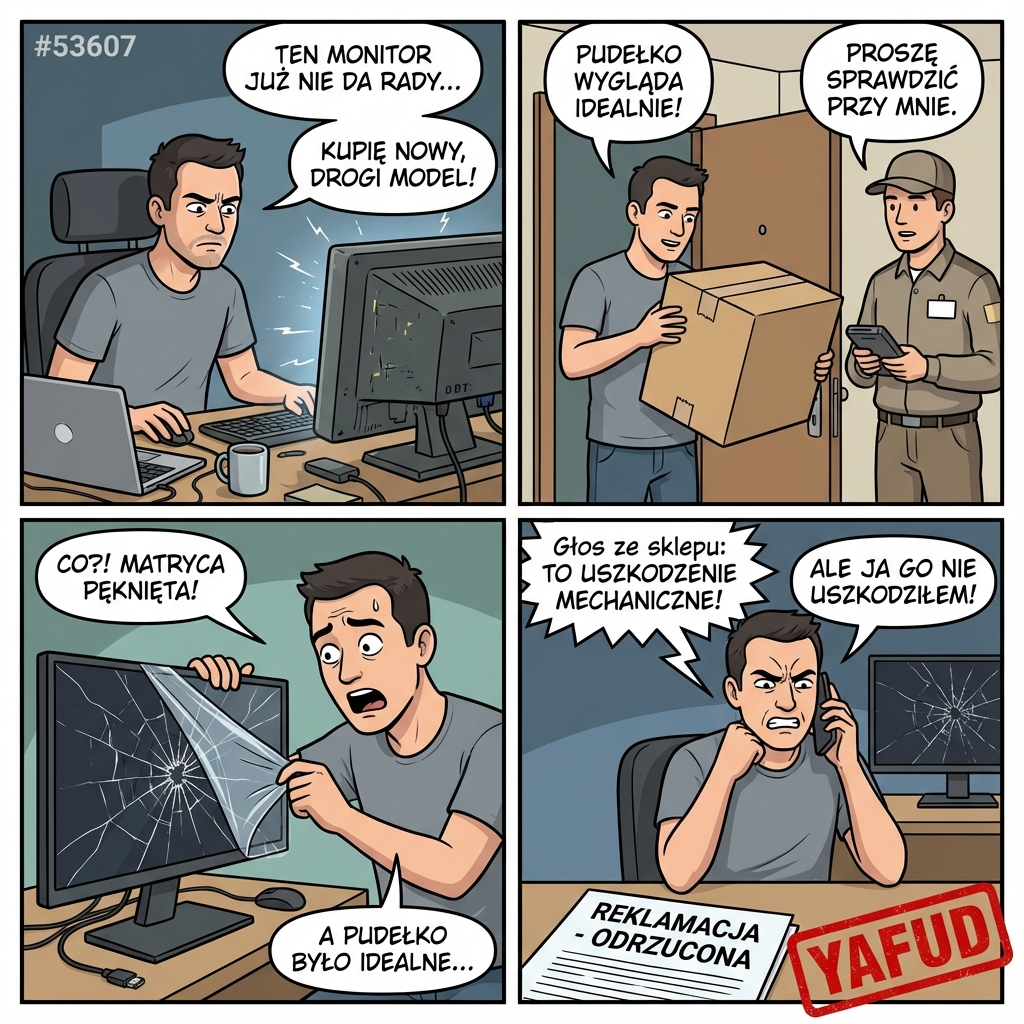 Kupiłem nowy, drogi monitor do pracy zdalnej, bo stary już migotał. Kurier przywiózł paczkę, sprawdziłem przy nim – pudełko nienaruszone. Postawiłem monitor na biurku, podłączyłem kable i zdjąłem folię ochronną. Okazało się, że matryca jest pęknięta pod spodem, mimo całego ekranu. Sklep odrzucił reklamację, twierdząc, że to uszkodzenie mechaniczne powstałe przy montażu. YAFUD«Poprzednia wpadka