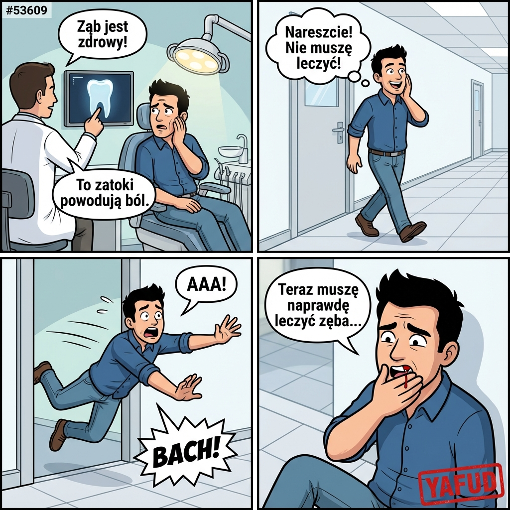 Od tygodnia boli mnie ząb, więc w końcu zapisałem się prywatnie do dentysty. Wizyta kosztowała fortunę, ale ból był nie do zniesienia. Dentysta zrobił prześwietlenie i stwierdził, że ząb jest zdrowy, a ból promieniuje od zatok. Wychodząc z gabinetu, potknąłem się na progu i upadłem twarzą na kafelki. Ukruszyłem jedynkę. Teraz naprawdę muszę leczyć zęba. YAFUD«Poprzednia wpadkaNastępna wpadka »