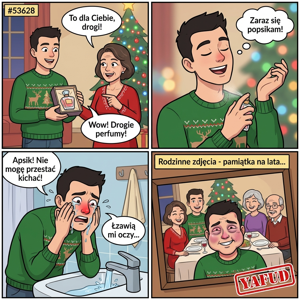 Dostałem pod choinkę od cioci drogie perfumy. Ucieszyłem się i od razu się popsikałem. Po chwili zacząłem kichać i łzawić. Okazało się, że jestem uczulony na jeden ze składników. Spędziłem Wigilię w łazience, przemywając twarz i szyję, a i tak spuchłem jak bania. Na zdjęciach rodzinnych wyglądam jak po walce bokserskiej. YAFUD«Poprzednia wpadkaNastępna wpadka »