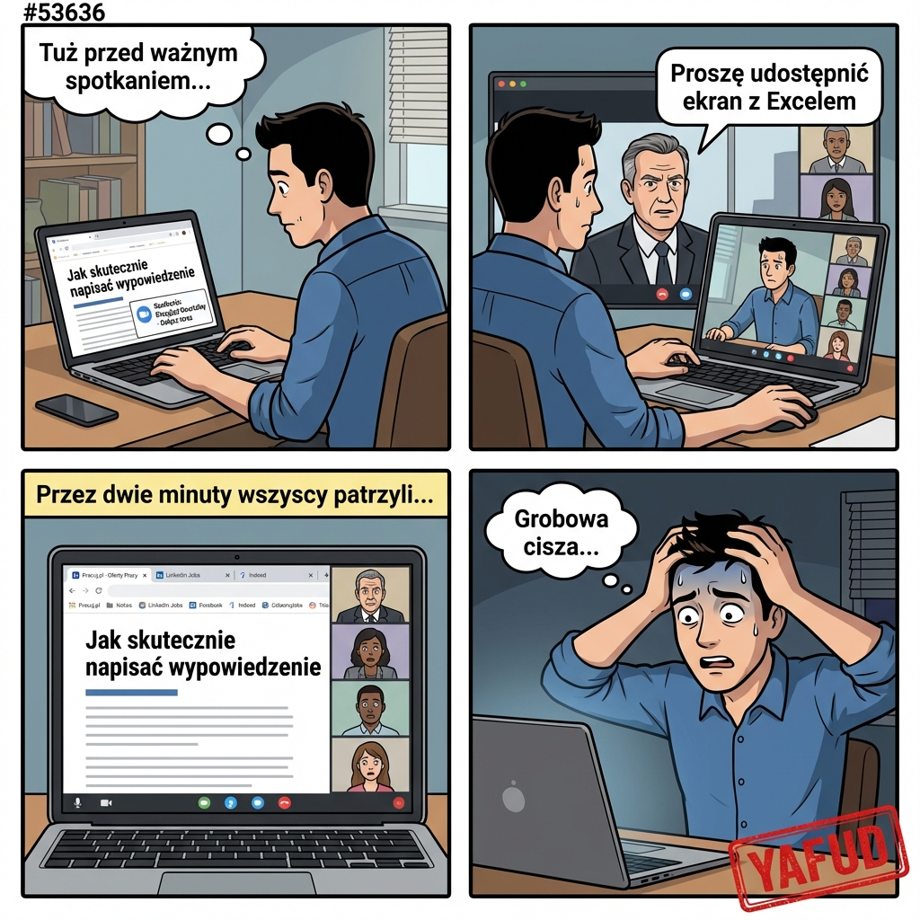 Mieliśmy dzisiaj ważne spotkanie online z dyrektorem regionalnym, podczas którego mieliśmy omawiać wyniki kwartalne. Tuż przed rozmową przeglądałem w Internecie oferty pracy, bo od dawna planuję zmienić firmę na lepiej płatną. Gdy zaczęła się prezentacja, szef poprosił mnie o szybkie udostępnienie ekranu z wykresem w Excelu. Byłem przekonany, że wybieram opcję udostępniania tylko jednego okna aplikacji, ale system zaznaczył cały pulpit. Przez dobre dwie minuty wszyscy, łącznie z dyrektorem, patrzyli na moją otwartą przeglądarkę z wielkim nagłówkiem "Jak skutecznie napisać wypowiedzenie". Zorientowałem się dopiero, gdy zapadła totalna, grobowa cisza. YAFUD«Poprzednia wpadkaNastępna wpadka »