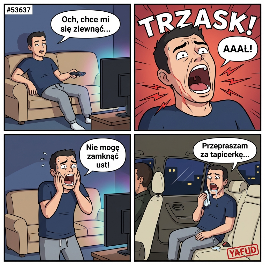 Siedziałem na kanapie i oglądałem telewizję, nic wielkiego. Zachciało mi się ziewnąć, więc otworzyłem szeroko usta. Nagle poczułem straszny ból i trzask w szczęce. Okazało się, że zwichnąłem żuchwę podczas ziewania i nie mogłem zamknąć ust. Musiałem jechać na SOR z otwartą buzią, śliniąc się na tapicerkę w taksówce. YAFUD«Poprzednia wpadkaNastępna wpadka »
