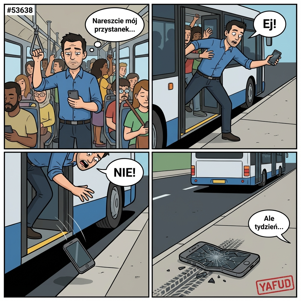 Los wystawił ci rachunek za stanie przy samych drzwiach, mistrzu logistyki. Autobus z precyzją chirurga dokonał eutanazji twojego telefonu.