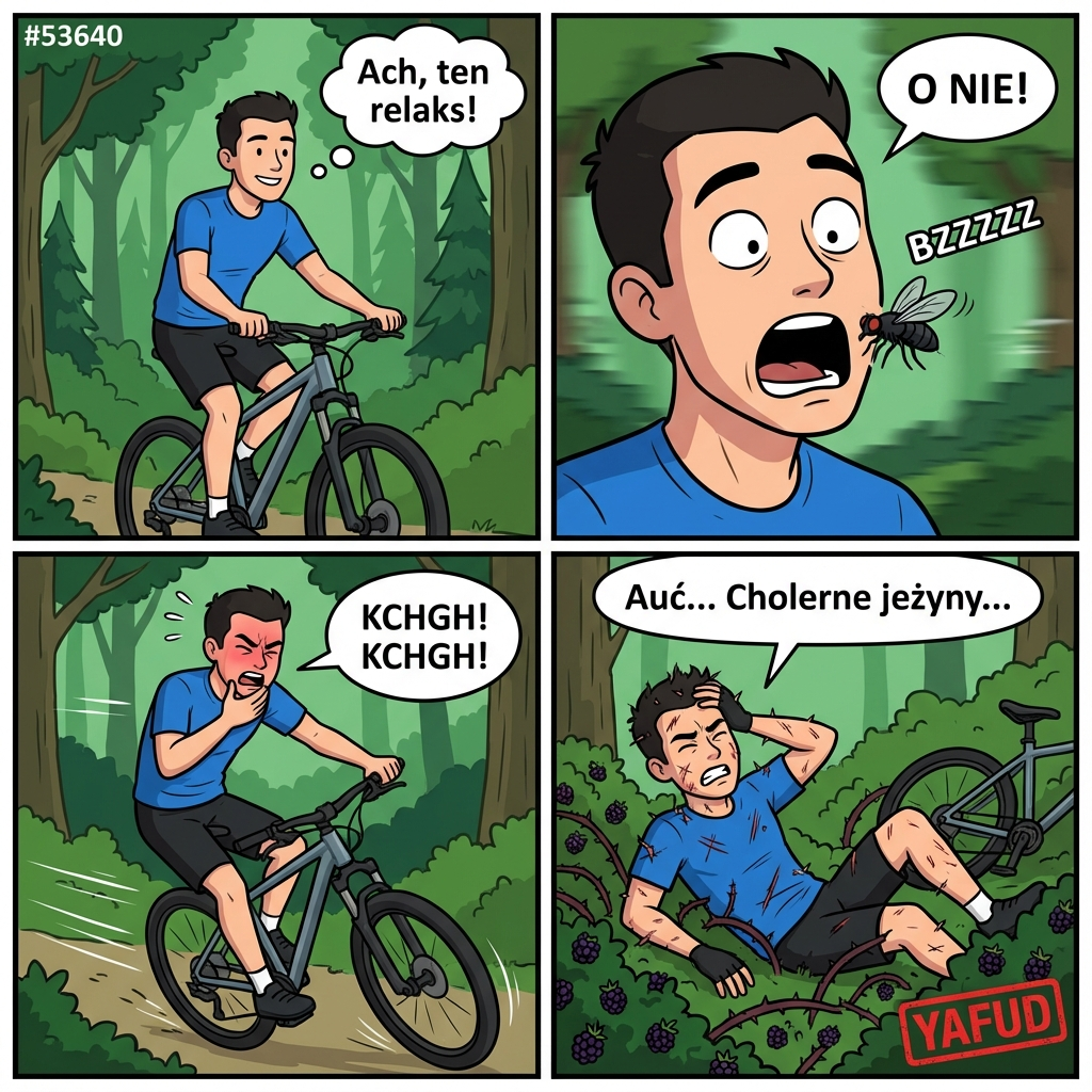 Postanowiłem pojeździć na rowerze po lesie. Zjeżdżałem z górki, wiatr we włosach, pełen relaks. Nagle wpadła mi do otwartych ust duża mucha. Zanim zdążyłem ją wypluć, odruchowo ją połknąłem. Zacząłem się krztusić, straciłem panowanie nad kierownicą i wjechałem prosto w gęste krzaki jeżyn. YAFUD«Poprzednia wpadkaNastępna wpadka »