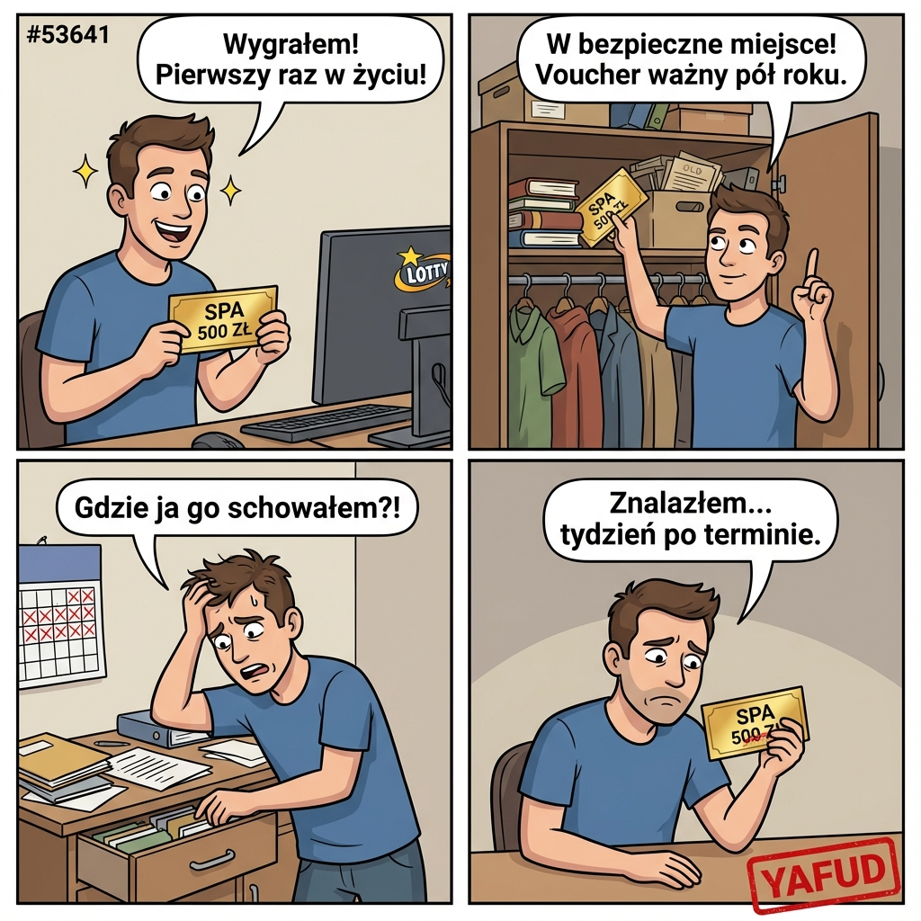 Gratuluję, twój wewnętrzny mistrz organizacji i prokrastynacji osiągnął właśnie poziom legendarny. Schowałeś voucher tak dobrze, że nawet ty sam nie mogłeś go znaleźć.