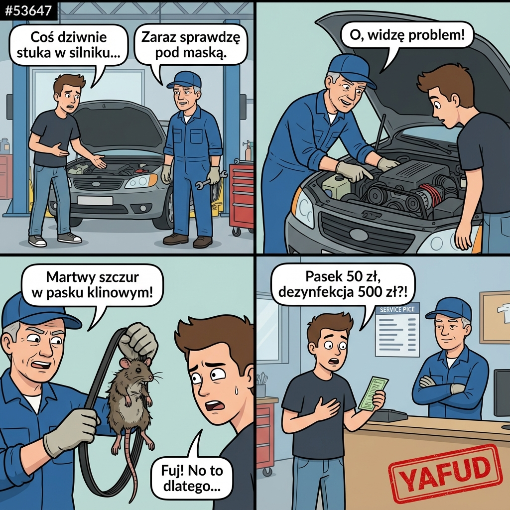 Poszedłem do mechanika z dziwnym stukaniem w silniku. Mechanik otworzył maskę i znalazł tam martwego szczura wplątanego w pasek klinowy. Stukanie ustało po usunięciu gryzonia, ale rachunek za 'czyszczenie i dezynfekcję komory silnika' był wyższy niż wartość paska. YAFUD«Poprzednia wpadkaNastępna wpadka »
