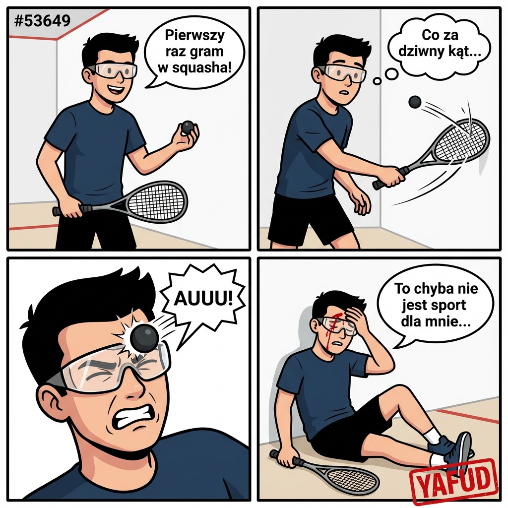 Pierwszy raz w życiu grałem w squasha. Piłeczka odbiła się od ściany pod dziwnym kątem i trafiła mnie prosto w oko. Pomimo okularów ochronnych, siła uderzenia w oprawkę rozcięła mi łuk brwiowy. Zalałem się krwią na korcie. To chyba nie jest jednak sport dla mnie. YAFUD«Poprzednia wpadkaNastępna wpadka »