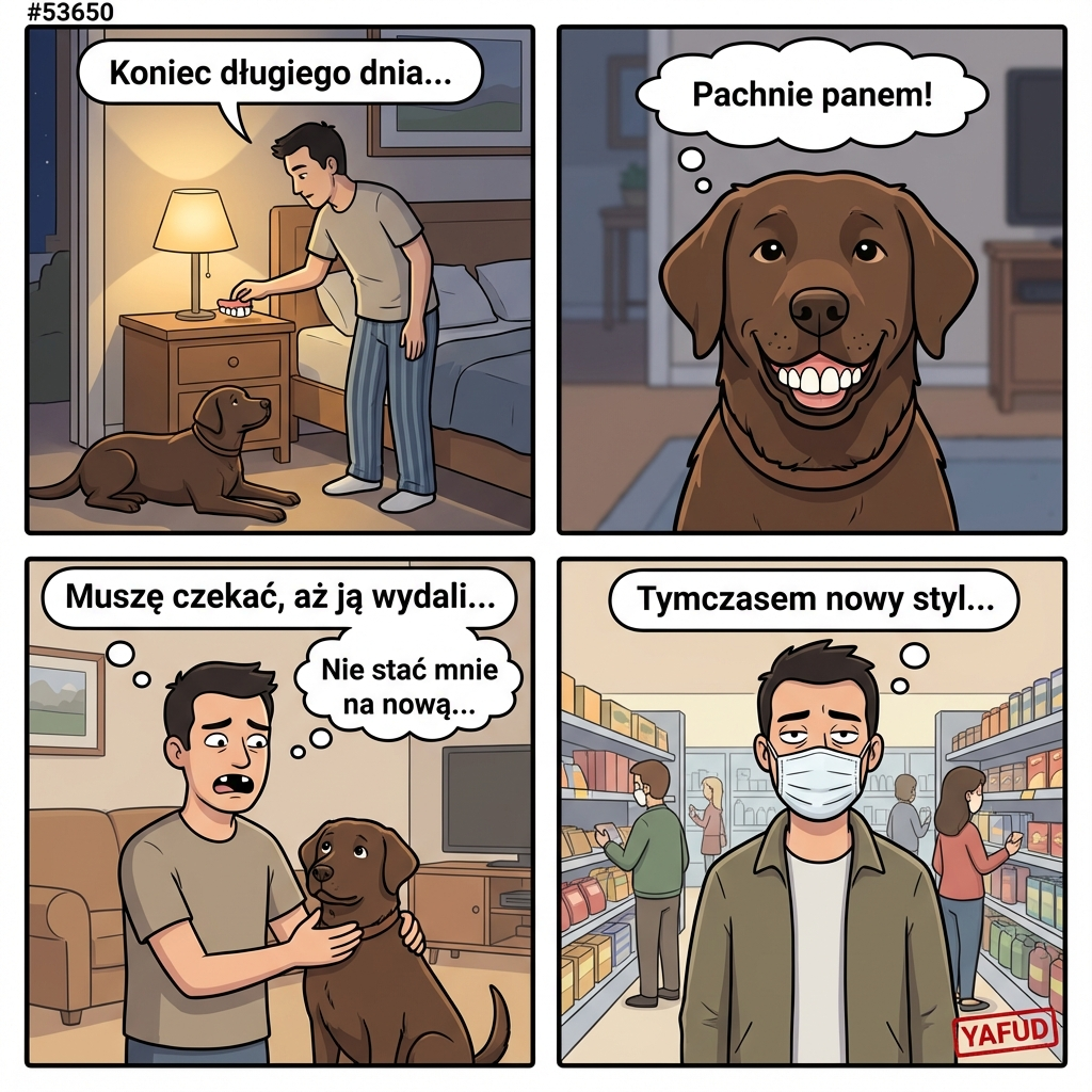 Mój pies zjadł moją protezę zębową (dwie jedynki na mostku), którą zostawiłem na szafce nocnej. Muszę czekać, aż ją wydali, żeby... no cóż, odzyskać sam mostek, bo na nową protezę mnie nie stać w tym miesiącu. Chodzę w maseczce. YAFUD«Poprzednia wpadka