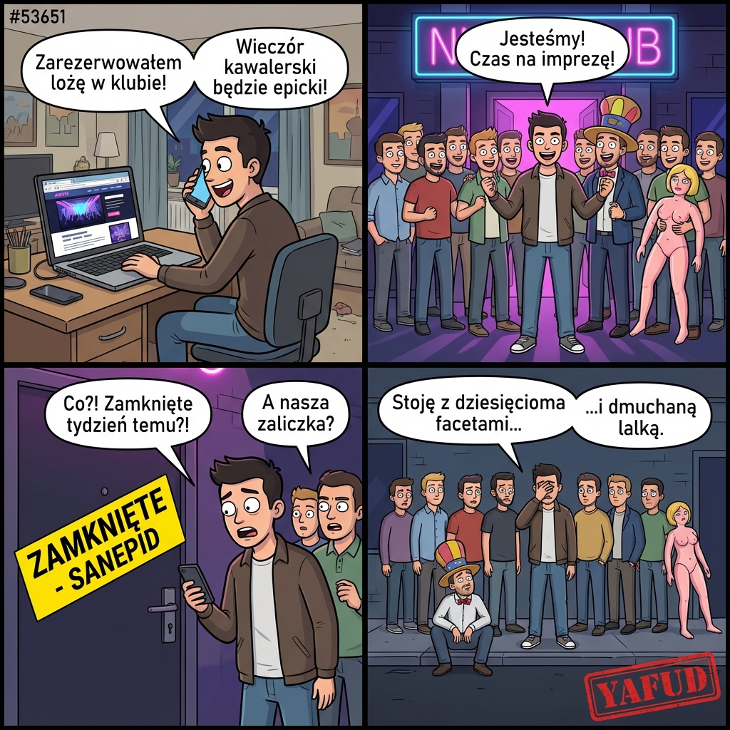 Organizowałem wieczór kawalerski kumpla. Zarezerwowałem lożę w klubie. Kiedy przyszliśmy, okazało się, że klub został zamknięty tydzień wcześniej przez sanepid, a moja rezerwacja (i zaliczka) przepadły. Staliśmy pod drzwiami z 10 facetami i dmuchaną lalką. YAFUD«Poprzednia wpadkaNastępna wpadka »