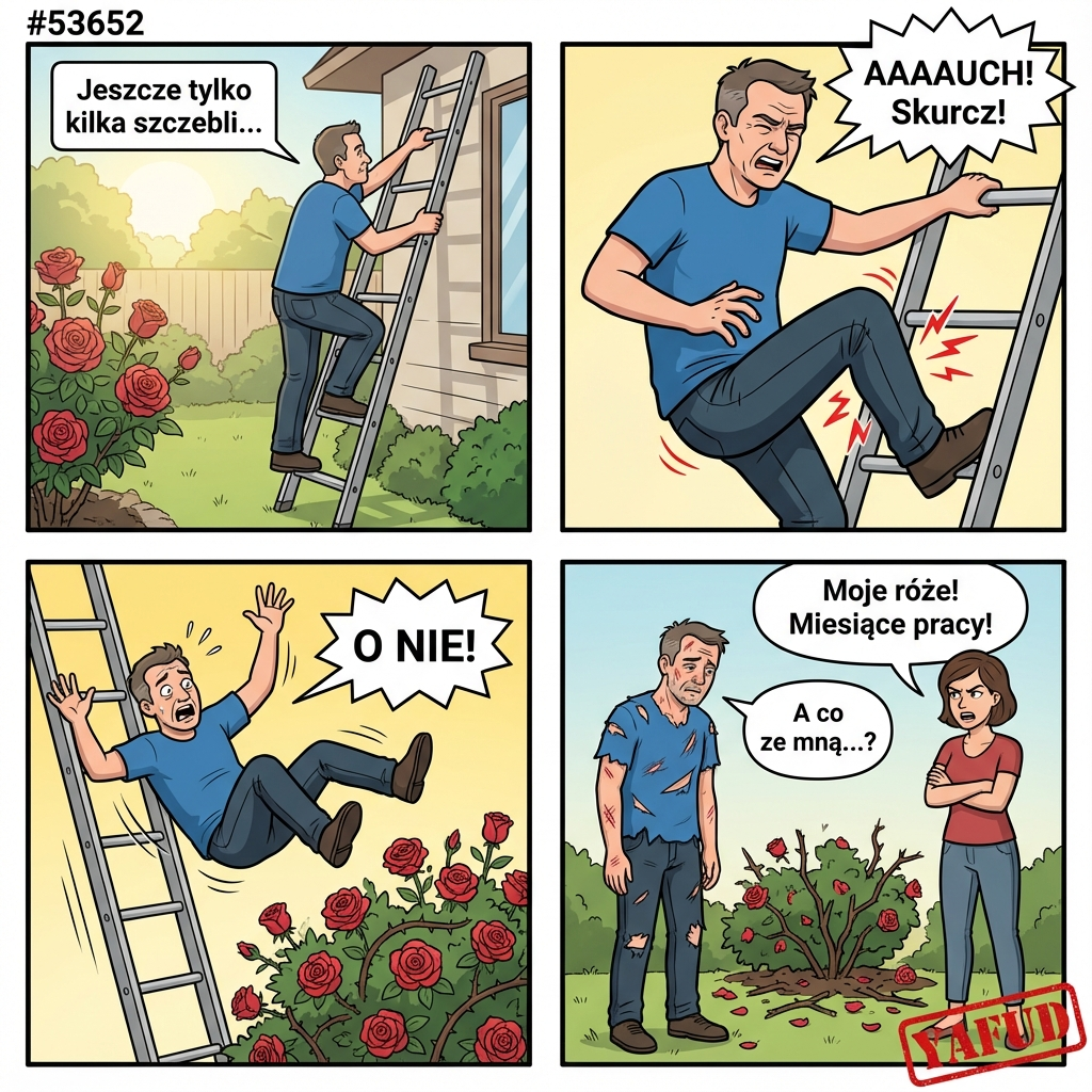 Ach, klasyka. Mężczyzna, drabina i niespodziewana zdrada własnego ciała. Zamiast skończyć pracę na wysokościach, zaliczyłeś twarde lądowanie w centrum botanicznej katastrofy. A żona zła o róże... typowe. Leżysz tam, krwawisz, twoje ciało jest podziurawione jak durszlak, a priorytetem jest flora ozdobna. Następnym razem pod drabinę podłóż materac. Albo lepiej – zdjęcia teściowej.