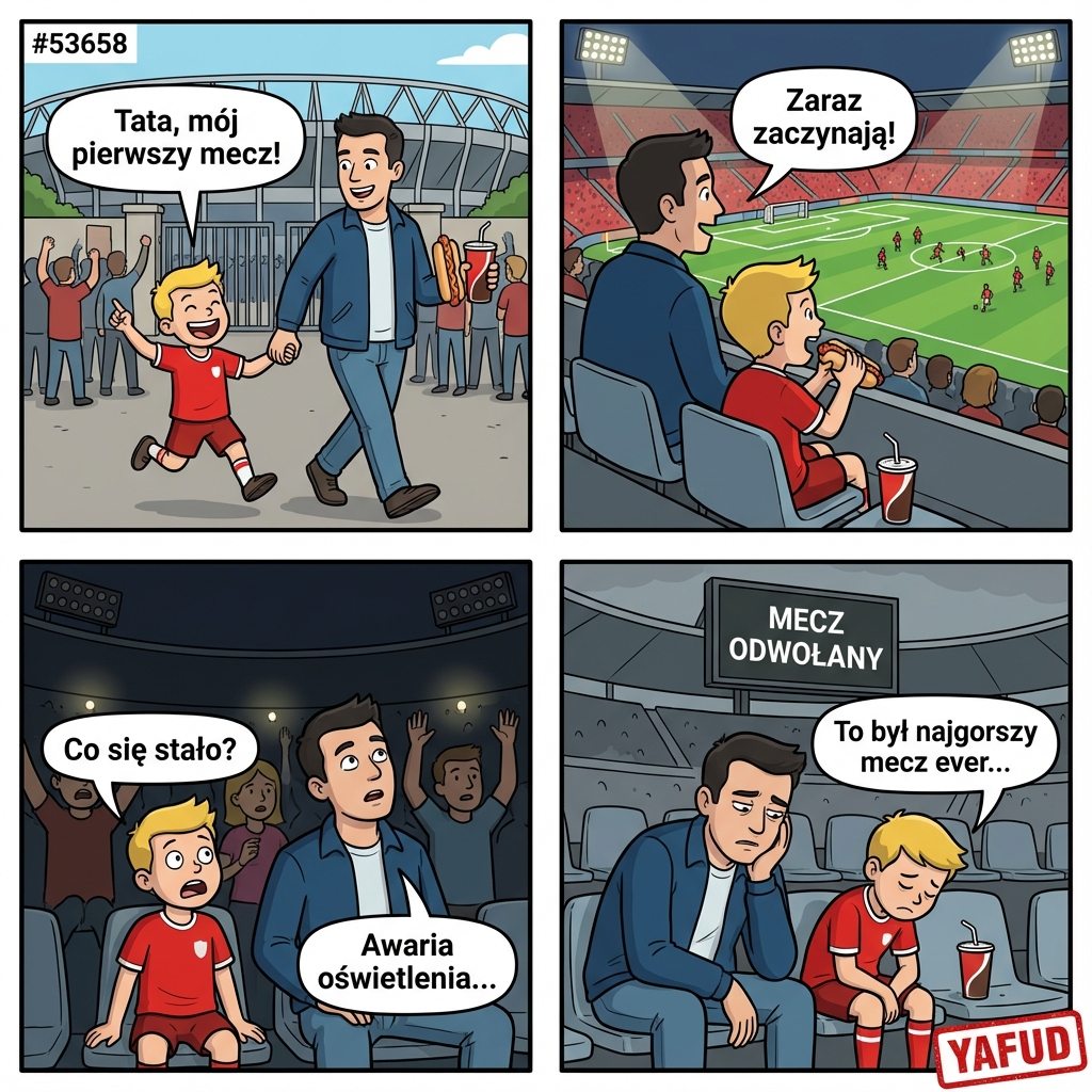 Zabrałem syna na mecz piłkarski. Były to jego pierwsze zawody na żywo, bardzo się cieszył. Usiedliśmy na trybunie, kupiłem mu hot-doga i colę. W trzeciej minucie mecz przerwano z powodu awarii oświetlenia. Czekaliśmy dwie godziny, po czym ogłoszono, że mecz został odwołany. YAFUD«Poprzednia wpadkaNastępna wpadka »