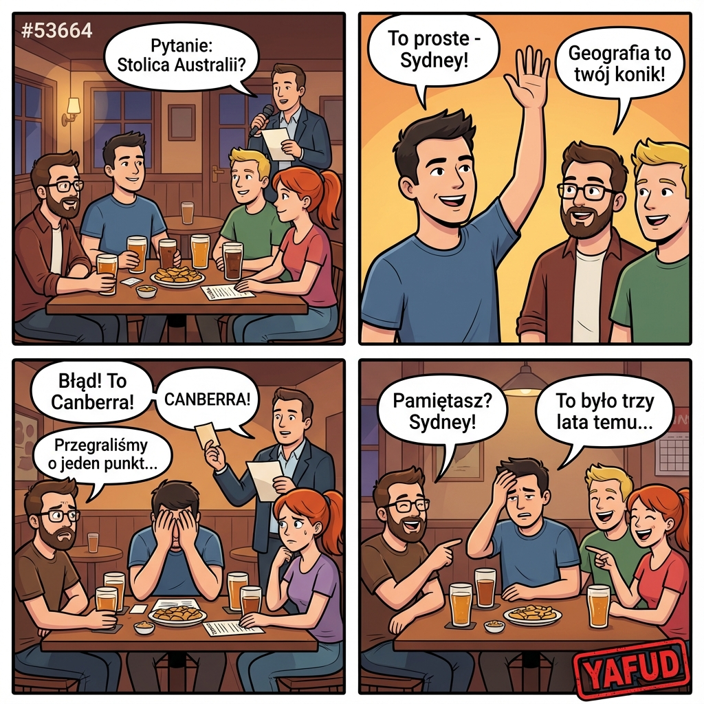 Wziąłem udział w quizie pubowym z przyjaciółmi. Jedną z kategorii była geografia, mój konik. Pytanie brzmiało: stolica Australii. Pewnie odpowiedziałem Sydney. Prawidłowa odpowiedź to Canberra. Przez pomyłkę przegraliśmy o jeden punkt. Przyjaciele przypominają mi o tym na każdym spotkaniu od trzech lat. YAFUD«Poprzednia wpadkaNastępna wpadka »