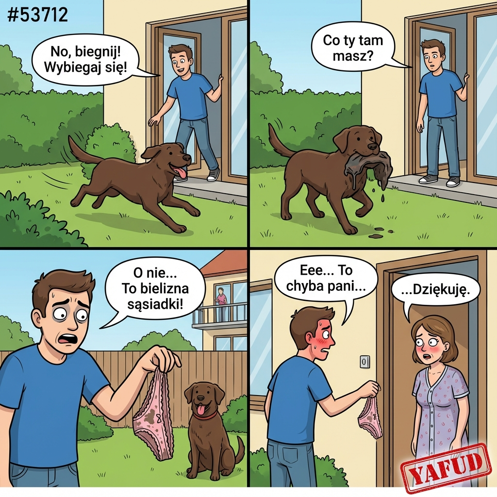 Wypuściłem psa na ogród, żeby się wybiegał. Wrócił po chwili, niosąc dumnie w pysku coś, co wyglądało jak brudna szmata. Kiedy przyjrzałem się bliżej, okazało się, że to koronkowa bielizna mojej sąsiadki, która suszyła się na jej balkonie. Wiatr musiał ją zwiać, a mój pies uznał to za świetną zabawkę. Oddawanie tego było najbardziej żenującym momentem w moim życiu. YAFUD«Poprzednia wpadkaNastępna wpadka »