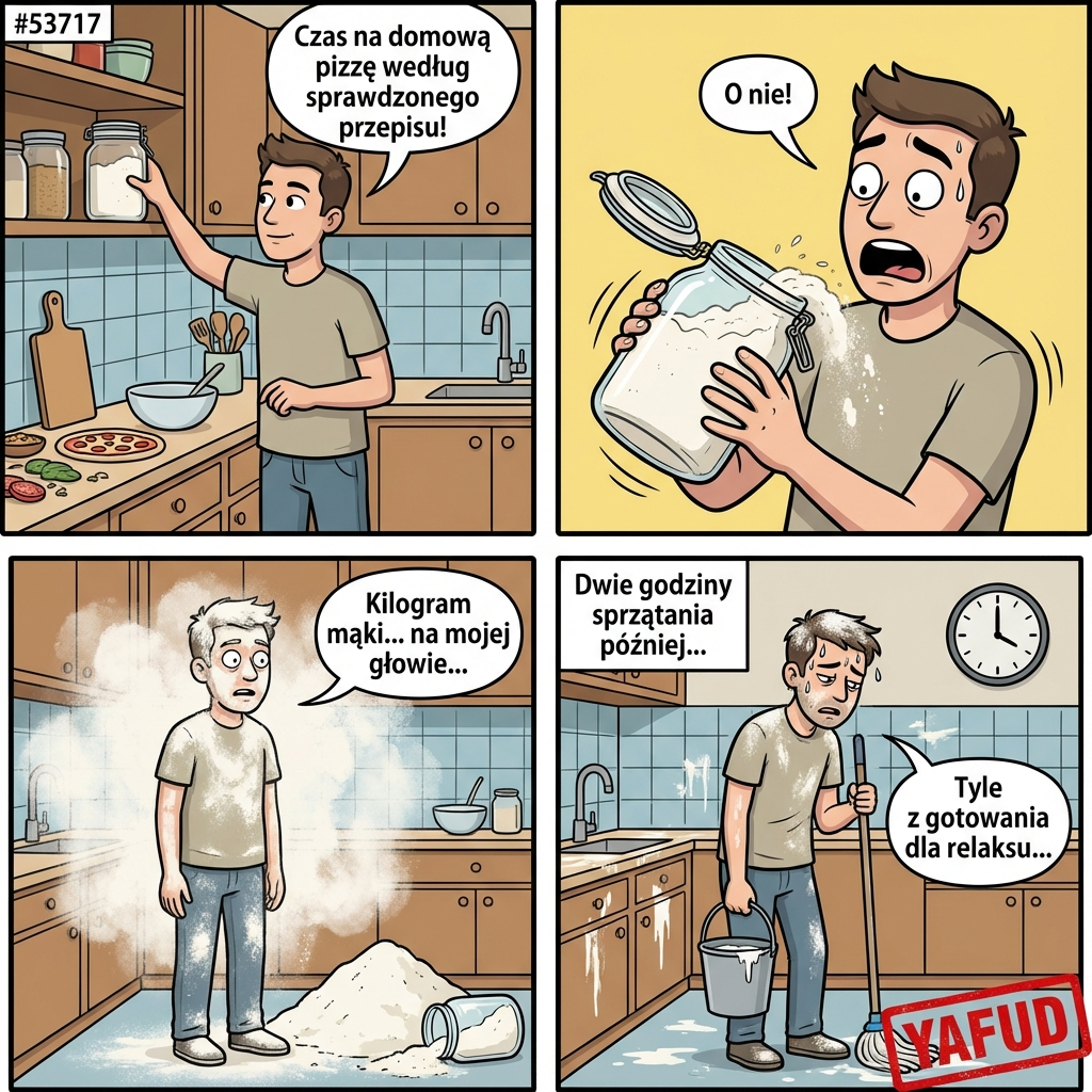 Robiłem ciasto na pizzę według sprawdzonego przepisu. Sięgnąłem po słoik z mąką, który stał na górnej półce. Wieczko było niedokręcone. Kiedy chwyciłem słoik, wyślizgnął mi się i kilogram mąki wylądował na mojej głowie, ubraniu i całej podłodze w kuchni. Sprzątałem ten biały pył przez dwie godziny. Dodam, że zazwyczaj gotuję dla zrelaksowania - no tym razem się nie udało... YAFUD«Poprzednia wpadkaNastępna wpadka »