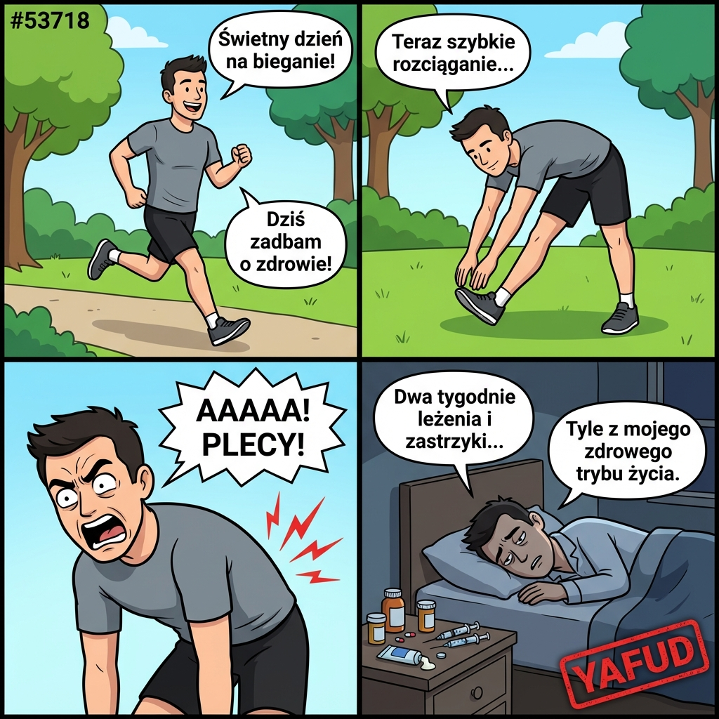 Poszedłem rano pobiegać, żeby dobrze zacząć dzień. Czułem się świetnie, pogoda była idealna. Podczas rozciągania w parku, przy zwykłym skłonie, poczułem przeraźliwy ból w plecach. Okazało się, że wypadł mi dysk. Zamiast zdrowego trybu życia, mam teraz dwa tygodnie leżenia plackiem i zastrzyki w tyłek. YAFUD«Poprzednia wpadkaNastępna wpadka »