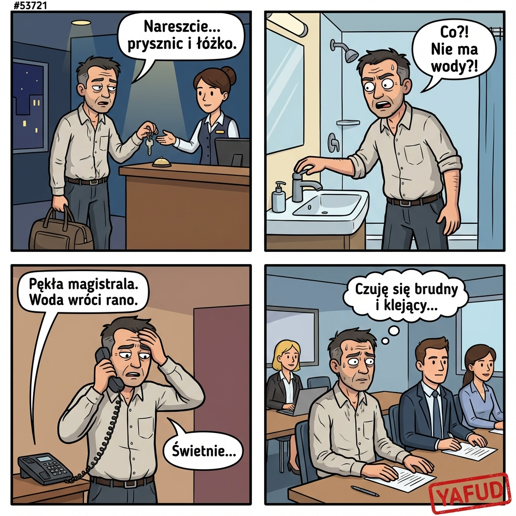 Wysłali mnie na szkolenie do innego miasta. Zameldowałem się w hotelu późnym wieczorem, marząc tylko o prysznicu i łóżku. Wchodzę do łazienki, odkręcam wodę, a tam susza. Okazało się, że w całej dzielnicy pękła magistrala wodociągowa i nie będzie wody do rana. Musiałem iść na szkolenie nieumyty, czując się brudny i klejący po podróży. YAFUD«Poprzednia wpadkaNastępna wpadka »
