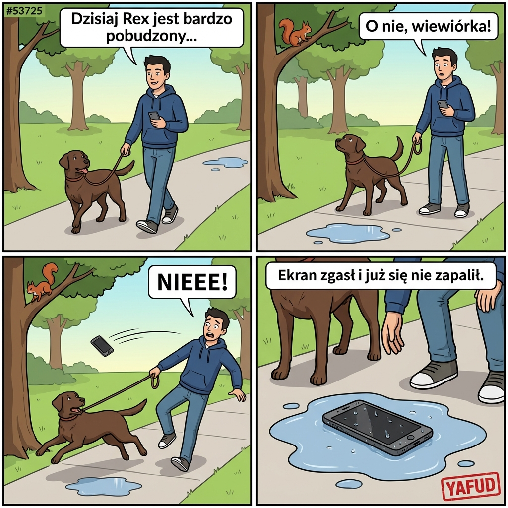 Wyprowadzałem psa na spacer. Był wyjątkowo pobudzony. Zobaczył wiewiórkę i szarpnął smyczą z taką siłą, że telefon, który trzymałem w tej samej ręce, wyleciał mi prosto w jedyną kałużę na całym chodniku. Ekran zgasł i już się nie zapalił. YAFUD«Poprzednia wpadkaNastępna wpadka »