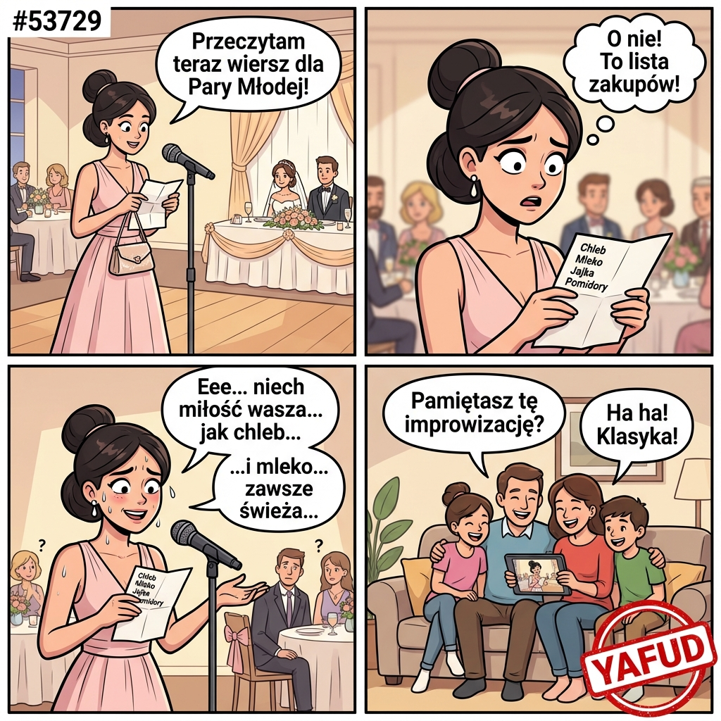 Byłam na weselu koleżanki jako świadkowa. Podczas składania życzeń miałam przeczytać wiersz, który sama napisałam. Wyciągnęłam kartkę z torebki i zanim zaczęłam czytać zorientowałam się, że to lista zakupów. Wiersz został w domu. Improwizowałam przez dwie minuty. Nagranie krąży w rodzinie do dziś. YAFUD«Poprzednia wpadkaNastępna wpadka »