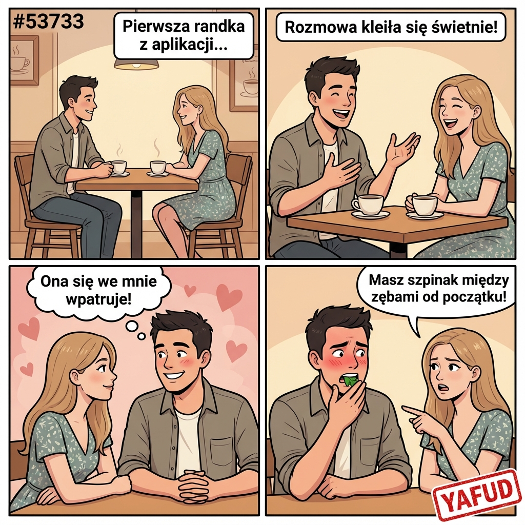 Poszedłem na pierwszą randkę z dziewczyną poznaną przez aplikację. Rozmowa kleiła się świetnie, mieliśmy podobne poczucie humoru i te same zainteresowania. W pewnym momencie ona zaczęła bardzo intensywnie przyglądać się mojej twarzy. Myślałem, że to zalotne spojrzenie, dopóki nie powiedziała: „Masz wielki kawałek szpinaku między jedynkami, od kiedy usiedliśmy”. YAFUD«Poprzednia wpadkaNastępna wpadka »