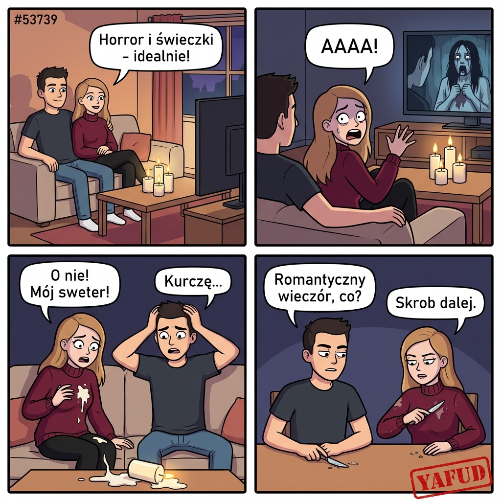 Umówiłem się z dziewczyną na oglądanie horroru u mnie. Chciałem zrobić nastrój, zapaliłem świeczki. W pewnym momencie, ze strachu na filmie, machnęła ręką i przewróciła świeczkę. Wosk wylał się na jej wełniany sweter. Zamiast romantycznego wieczoru, spędziliśmy dwie godziny skrobiąc wosk i denerwując się na siebie. YAFUD«Poprzednia wpadkaNastępna wpadka »
