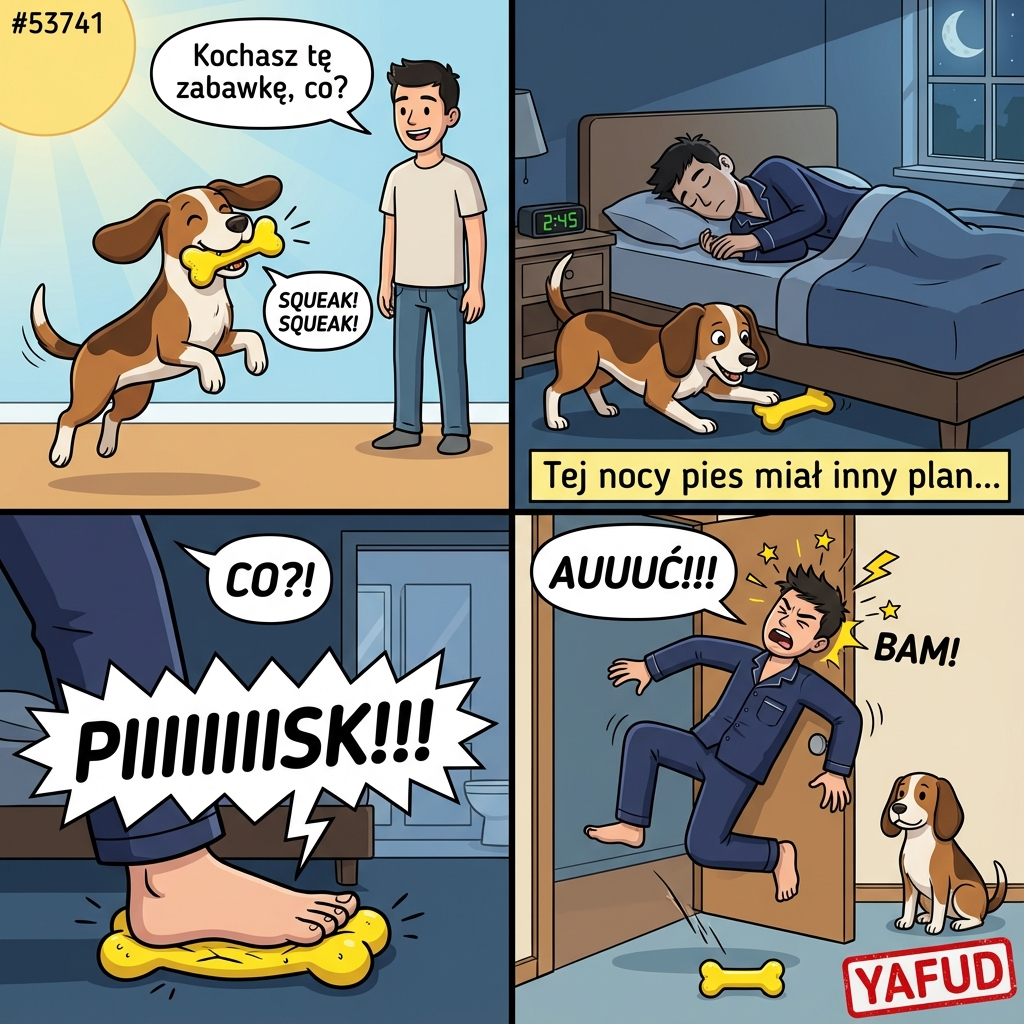 Mój pies uwielbia bawić się piszczącą zabawką. Zazwyczaj robi to w dzień, ale dzisiaj w nocy zaniósł ją sobie pod moje łóżko. Kiedy o 3 nad ranem wstawałem do toalety, nadepnąłem na nią całą stopą. Pisk był tak przeraźliwie głośny w ciszy nocnej, że aż podskoczyłem, uderzając głową o framugę drzwi. YAFUD«Poprzednia wpadkaNastępna wpadka »