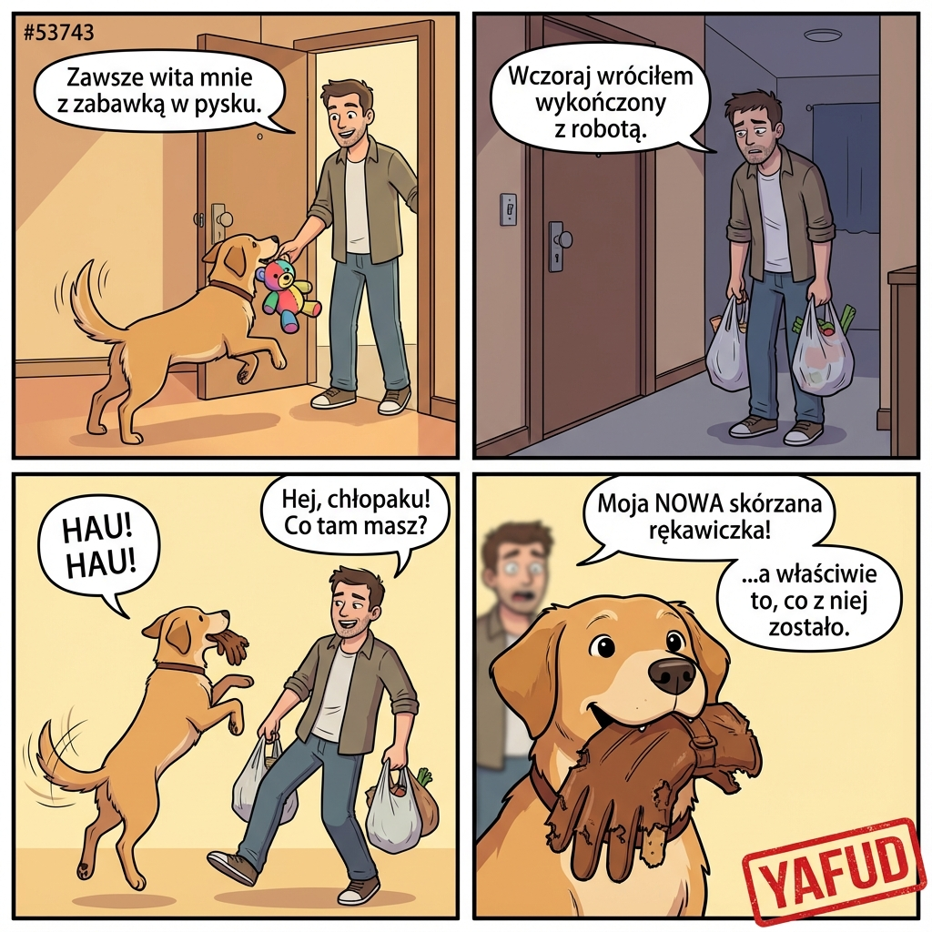 Mój pies ma zwyczaj witania mnie w drzwiach z jakąś zabawką w pysku. Wczoraj wróciłem z pracy wykończony, niosąc siatki z zakupami. Pies skoczył na mnie radośnie, machając ogonem jak szalony. Dopiero po chwili zorientowałem się, że tym razem nie trzyma w pysku pluszaka, ale moją nową, skórzaną rękawiczkę, którą zostawiłem rano na szafce. A właściwie to, co z niej zostało, czyli sam nadgarstek. Palce zostały zjedzone. YAFUD«Poprzednia wpadkaNastępna wpadka »