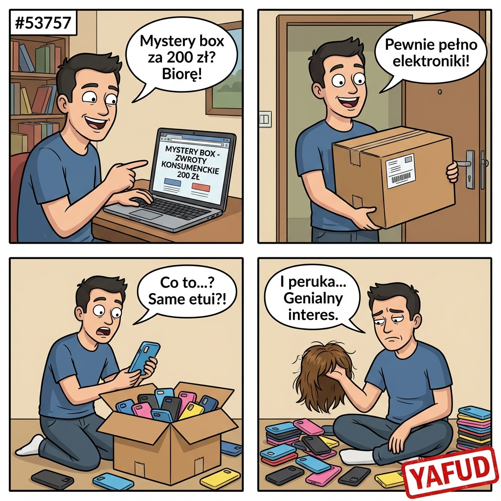 Kupiłem w internecie 'niespodziankę' - tajemnicze pudełko ze zwrotami konsumenckimi. Zapłaciłem 200 złotych, licząc na elektronikę. W paczce było 50 sztuk etui na telefon model, którego nikt już nie używa od 10 lat, i jedna używana peruka. YAFUD«Poprzednia wpadkaNastępna wpadka »