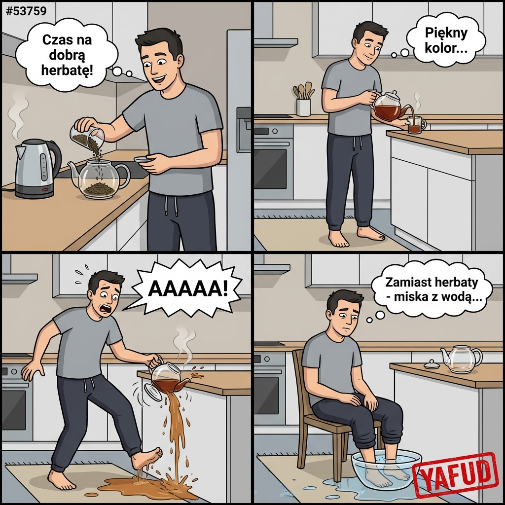 Chciałem zrobić sobie herbatę. Wsypałem liście do dzbanka i zalałem wrzątkiem. Kiedy nalewałem napar do kubka, dno szklanego dzbanka po prostu odpadło. Wrzątek wylał się na moje bose stopy i dywan. Zamiast pić herbatę, siedzę z nogami w misce z zimną wodą i czekam, aż ból ustąpi. YAFUD«Poprzednia wpadkaNastępna wpadka »