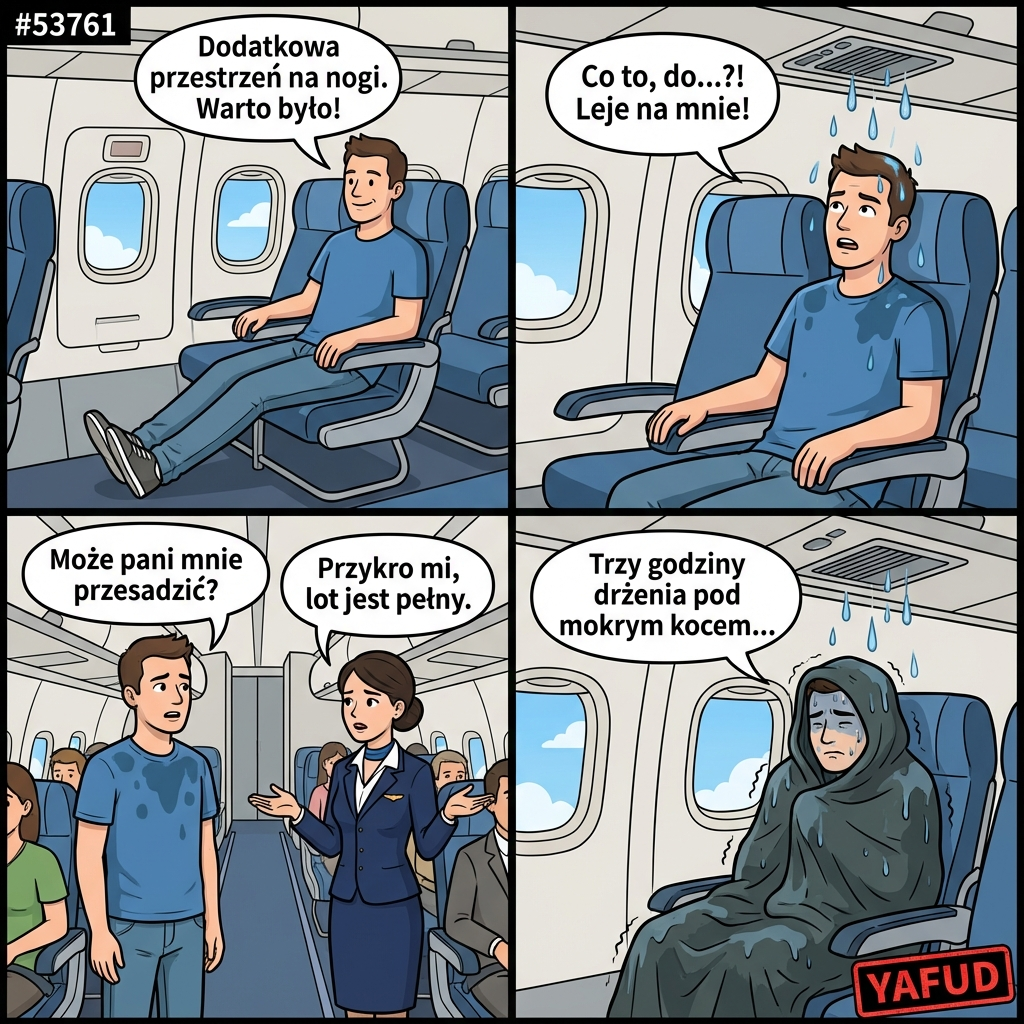 Wracałem samolotem z wakacji. Kupiłem sobie miejsce z dodatkową przestrzenią na nogi przy wyjściu awaryjnym. Niestety, system klimatyzacji nad moim siedzeniem uległ awarii i kapała z niego lodowata woda prosto na moje ramię. Stewardesa powiedziała, że lot jest pełny i nie może mnie przesadzić. Przez trzy godziny lotu siedziałem przykryty kocem, który szybko nasiąkł, trzęsąc się z zimna. YAFUD«Poprzednia wpadkaNastępna wpadka »