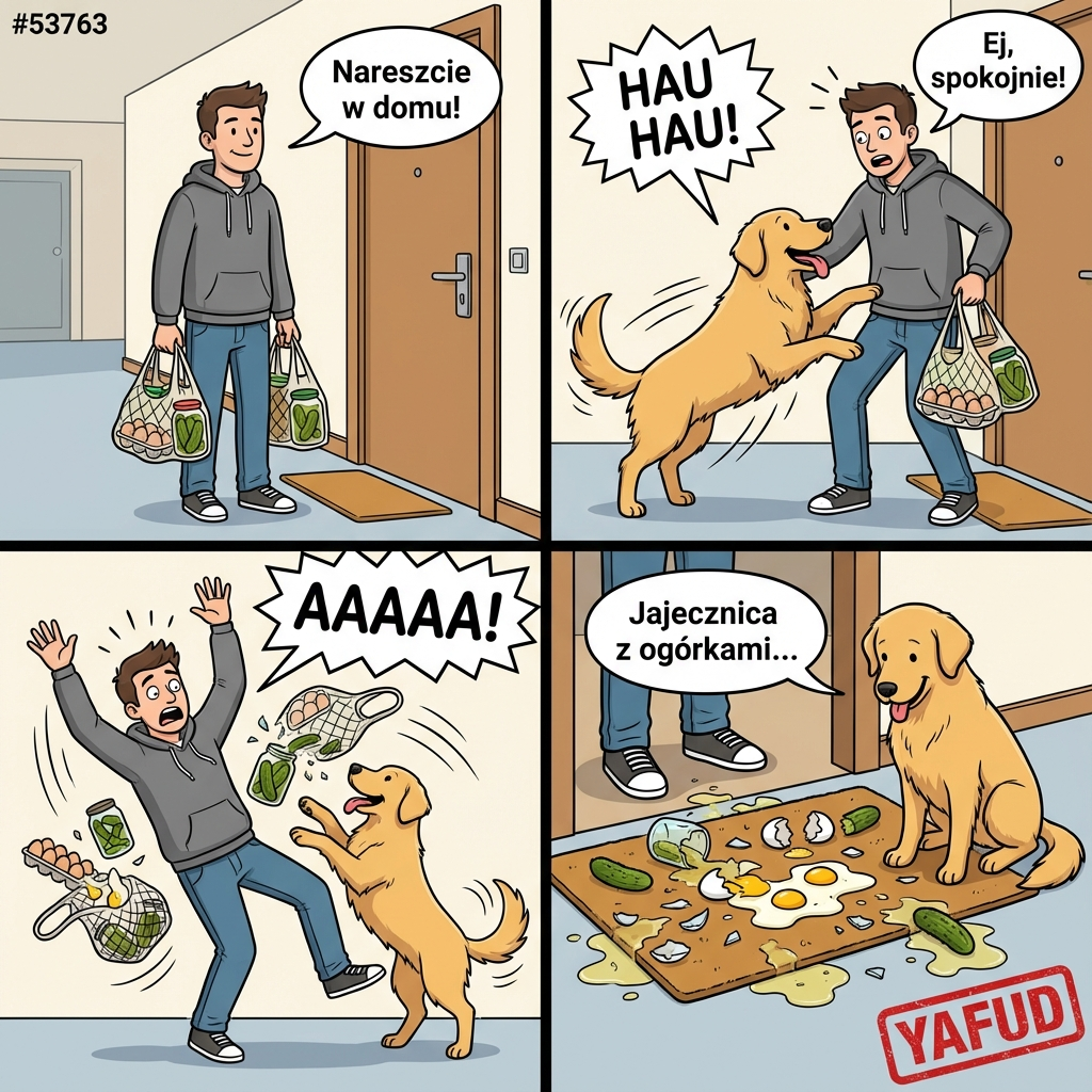 Mój pies ma zwyczaj witania mnie w drzwiach. Dziś wróciłem z zakupami, niosąc dwie pełne siatki jajek i słoików. Pies skoczył na mnie z radości, ja straciłem równowagę i upuściłem obie siatki. Jajecznica z ogórkami kiszonymi na wycieraczce. YAFUD«Poprzednia wpadkaNastępna wpadka »