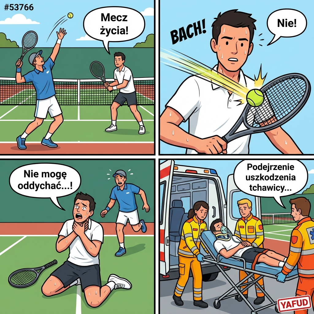 Grałem w tenisa. Przeciwnik zaserwował bardzo mocno. Piłka odbiła się od ramy mojej rakiety i trafiła mnie prosto w krtań. Zacząłem się dusić i upadłem na kort. Zamiast meczu życia, miałem walkę o oddech i transport karetką z podejrzeniem uszkodzenia tchawicy. YAFUD«Poprzednia wpadkaNastępna wpadka »