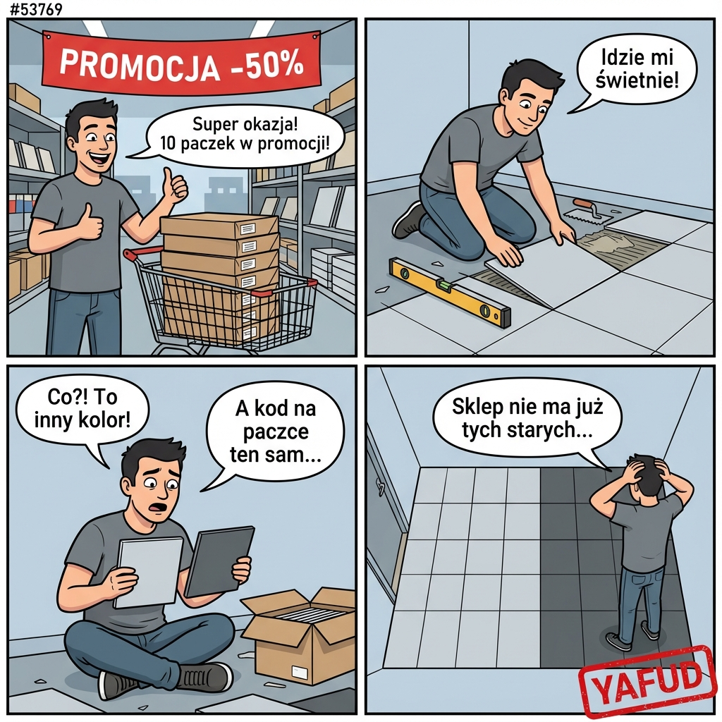 Kupiłem w promocji 10 paczek płytek do łazienki. Położyłem już połowę podłogi, gdy otworzyłem kolejną paczkę. Okazało się, że choć kod na opakowaniu jest ten sam, odcień płytek jest zupełnie inny – fabryka zmieniła partię produkcyjną. Sklep nie ma już tych starych, a ja mam dwukolorową podłogę. YAFUD«Poprzednia wpadkaNastępna wpadka »