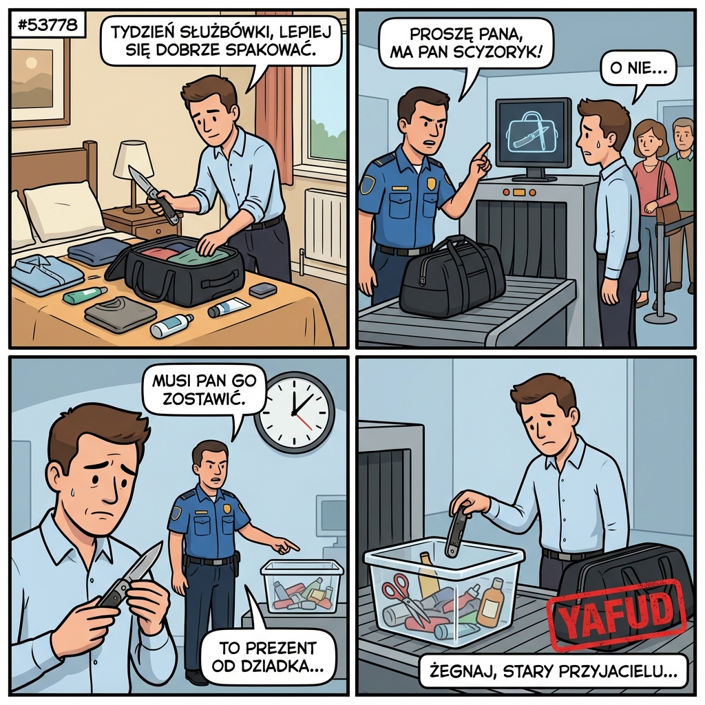 Spakowałem się na tygodniowy wyjazd służbowy. Na lotnisku, przy kontroli bezpieczeństwa, okazało się, że w bagażu podręcznym zostawiłem duży scyzoryk, prezent od dziadka. Musiałem go wyrzucić do kosza, bo nie miałem czasu na nadanie bagażu rejestrowanego. YAFUD«Poprzednia wpadka
