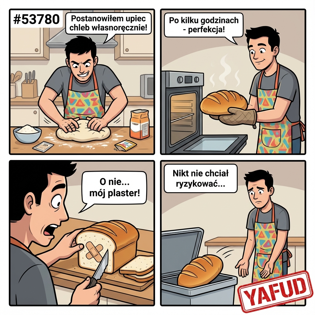 Postanowiłem upiec chleb. Wyrabiałem ciasto ręcznie, wkładając w to sporo serca. Po upieczeniu i ostygnięciu ukroiłem pierwszą kromkę. W środku, zapieczony w miąższu, tkwił mój plaster, który miałem na palcu. Musiał się zsunąć podczas wyrabiania. Cały bochenek wylądował w koszu, bo nikt nie miał ochoty ryzykować jedzenia 'z dodatkami'. YAFUD«Poprzednia wpadka