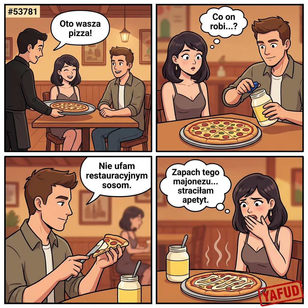Byłam na randce w ciemno. Facet wydawał się w porządku, dopóki nie zamówiliśmy jedzenia. Kiedy kelner przyniósł pizzę, mój towarzysz wyciągnął z kieszeni własny słoik z majonezem i zaczął smarować nim każdy kawałek. Powiedział, że nie ufa restauracyjnym sosom. Zapach majonezu w ciepłej restauracji był tak intensywny, że straciłam apetyt. YAFUD«Poprzednia wpadka