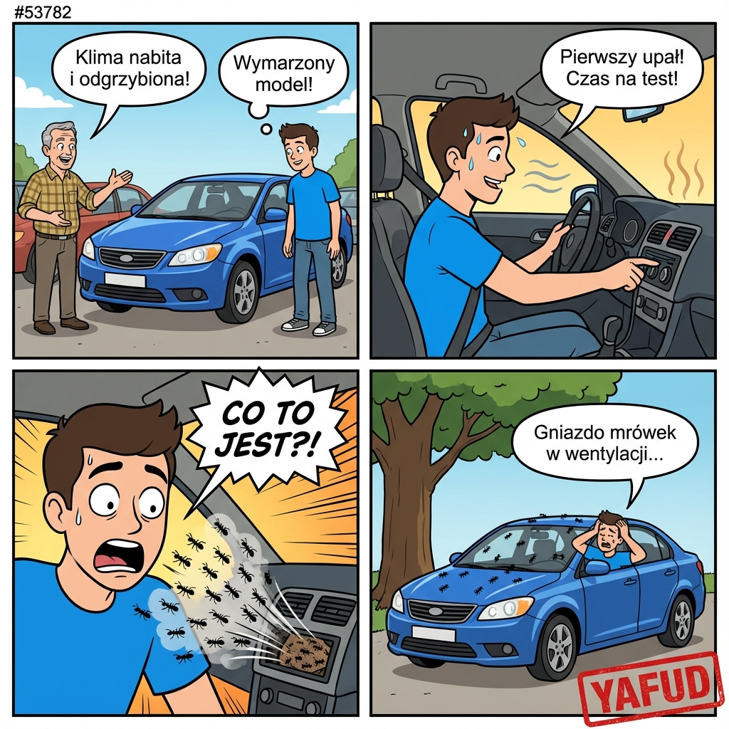 Kupiłem używany samochód, wymarzony model. Sprzedawca zapewniał, że klima jest nabita i odgrzybiona. Pierwszy upał, włączam klimatyzację, a z kratek wylatuje chmara mrówek. Okazało się, że samochód stał długo pod drzewem i mrówki zrobiły sobie gniazdo w układzie wentylacji. YAFUD«Poprzednia wpadkaNastępna wpadka »