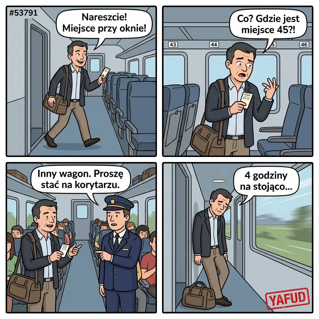 Wracałem pociągiem z delegacji. Miałem bilet na miejsce przy oknie. Gdy wsiadłem, okazało się, że moje miejsce numer 45 nie istnieje, bo podstawili inny typ wagonu. Konduktor kazał mi stać na korytarzu przez całe 4 godziny podróży, bo pociąg był pełny. YAFUD«Poprzednia wpadka