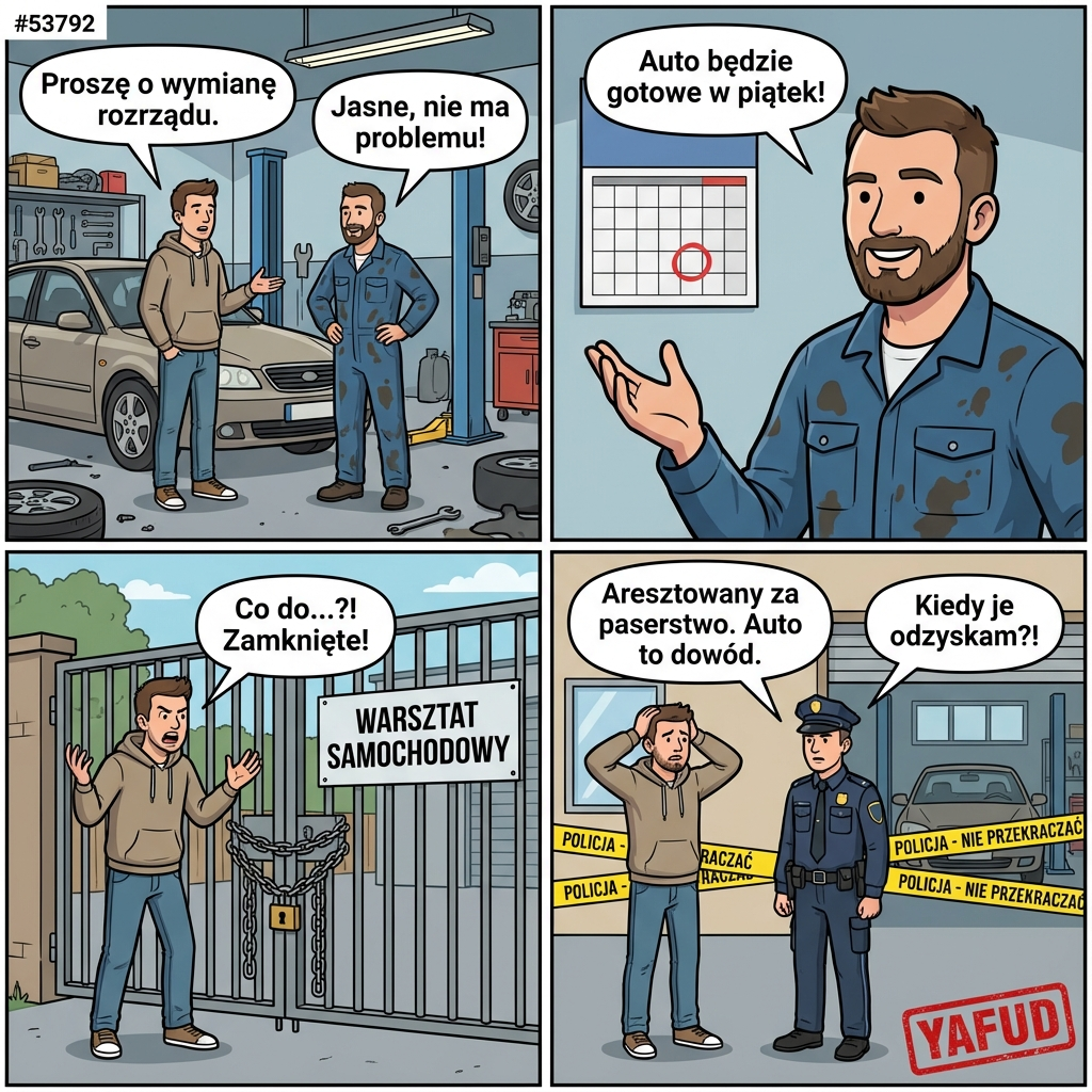 Umówiłem się z mechanikiem na wymianę rozrządu. Powiedział, że auto będzie gotowe na piątek. Przyjechałem w piątek, warsztat zamknięty na cztery spusty. Okazało się, że mechanik został aresztowany za paserstwo częściami samochodowymi, a moje auto stoi w środku jako dowód w sprawie i nie mogę go odzyskać do czasu wyjaśnienia. YAFUD«Poprzednia wpadka