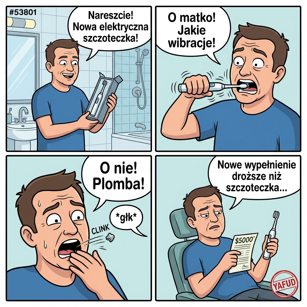 Kupiłem nową szczoteczkę elektryczną. Przy pierwszym myciu wibracje były tak silne, że wypadła mi plomba z zęba. Połknąłem ją. Teraz muszę zapłacić dentyście za nowe wypełnienie więcej niż kosztowała ta szczoteczka. YAFUD«Poprzednia wpadkaNastępna wpadka »