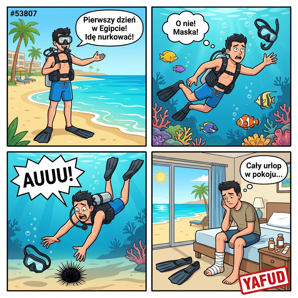 Byłem na wakacjach w Egipcie. Pierwszego dnia poszedłem nurkować. Zgubiłem maskę w wodzie. Próbując ją złapać, nadepnąłem na jeżowca. Spędziłem resztę urlopu w hotelowym pokoju z zabandażowaną stopą, nie mogąc wejść do wody ani chodzić na wycieczki. YAFUD«Poprzednia wpadkaNastępna wpadka »