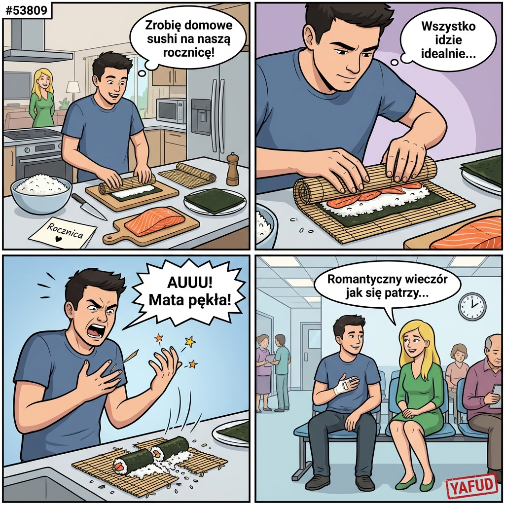 Postanowiłem zrobić domowe sushi na rocznicę związku. Gotowałem ryż zgodnie z instrukcją, kupiłem świeżą rybę i drogie nori. Kiedy rolowałem pierwszy kawałek, mata bambusowa pękła, a drzazga wbiła mi się głęboko pod paznokieć. Wieczór spędziliśmy na SOR-ze, zamiast przy kolacji. YAFUD«Poprzednia wpadkaNastępna wpadka »