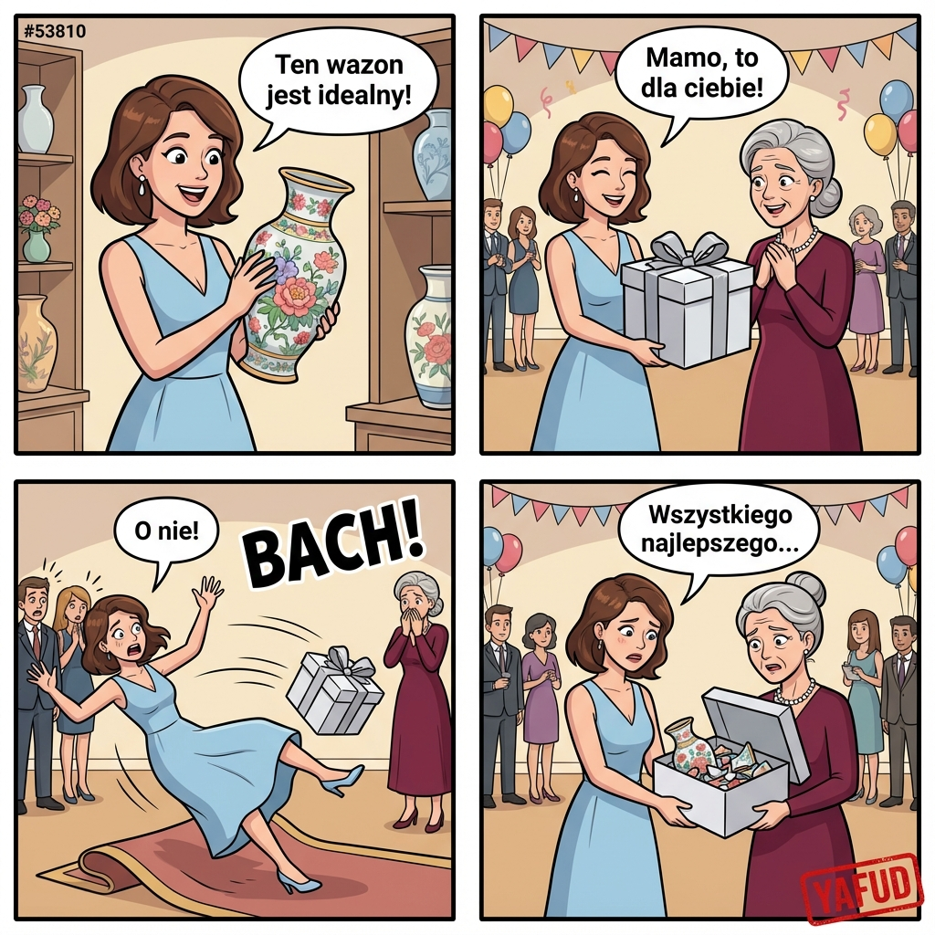 Długo szukałam idealnego prezentu na 60. urodziny mamy. Kupiłam jej piękny, ręcznie malowany wazon, o którym marzyła. Zapakowałam go starannie i pojechałam na imprezę. Wręczając prezent, potknęłam się o dywan. Pudełko wypadło mi z rąk, a dźwięk tłuczonego szkła uciszył całą salę. Wręczyłam mamie pudełko pełne skorup. YAFUD«Poprzednia wpadkaNastępna wpadka »