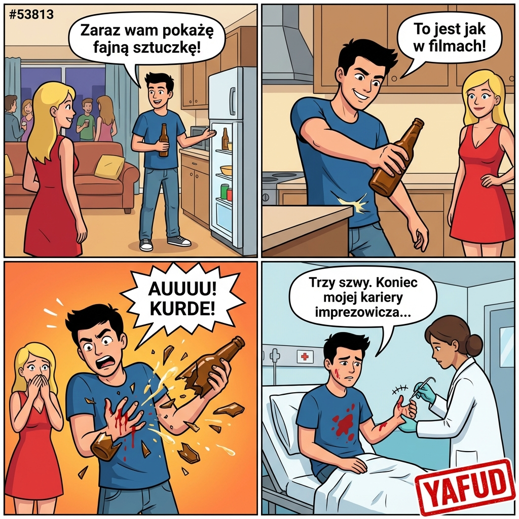 Byłem na domówce u znajomych. Wziąłem piwo z lodówki i chciałem je otworzyć o krawędź blatu, żeby zaimponować koleżance. Butelka pękła w mojej dłoni. Zamiast popisać się sprytem, spędziłem wieczór na SOR-ze, gdzie zakładali mi trzy szwy na kciuku. YAFUD«Poprzednia wpadkaNastępna wpadka »